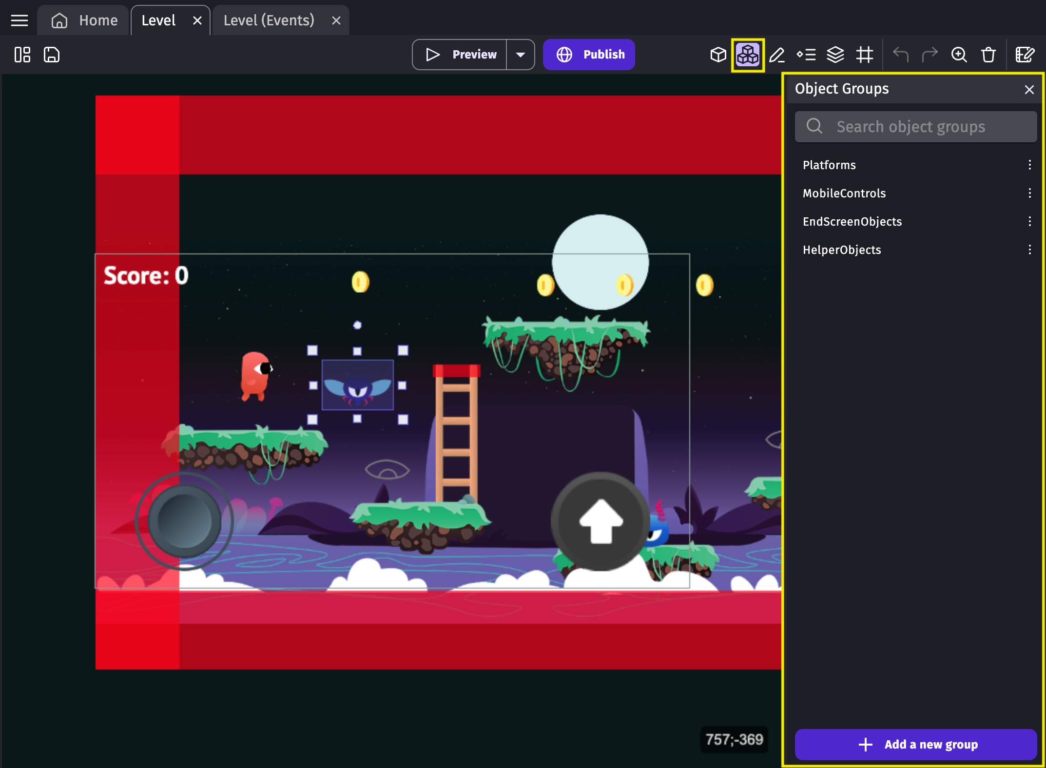 Object groups contain objects and can be used in events to refer to multiple objects, using a single event. Read more about them on the page about common features for all objects.