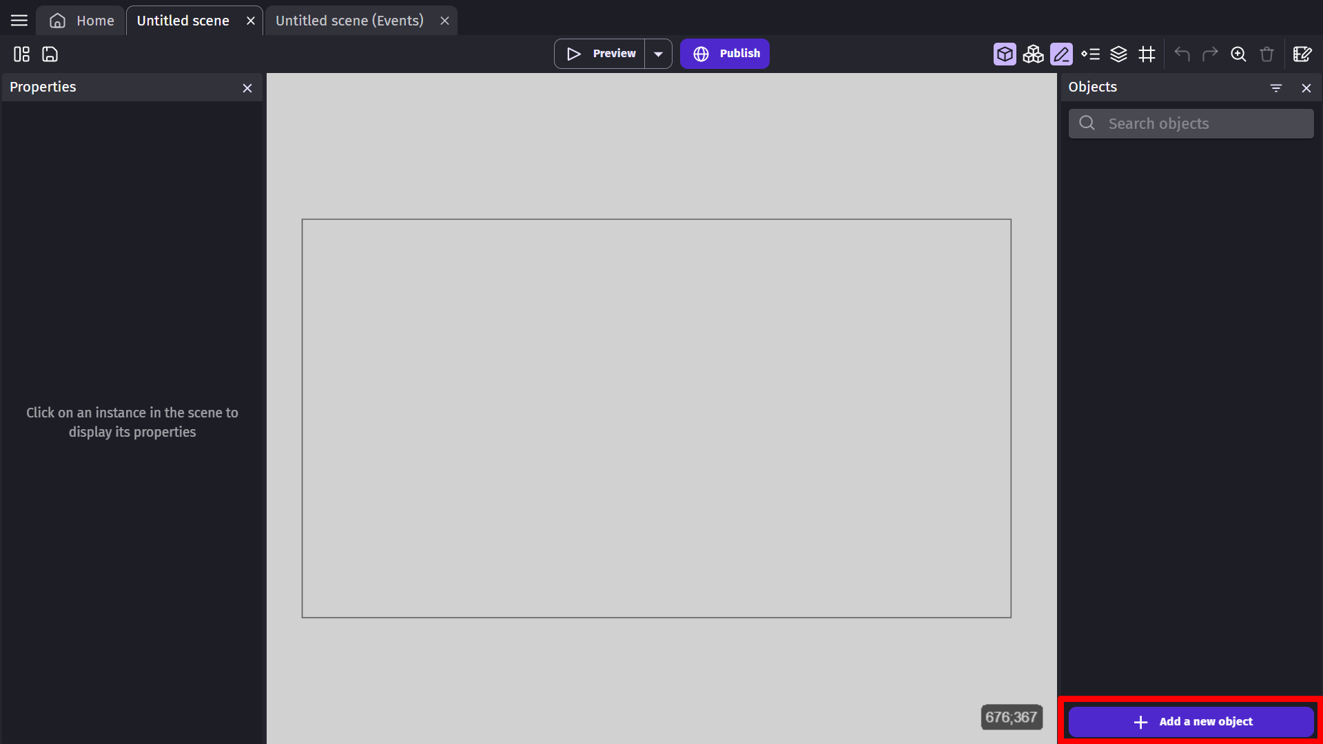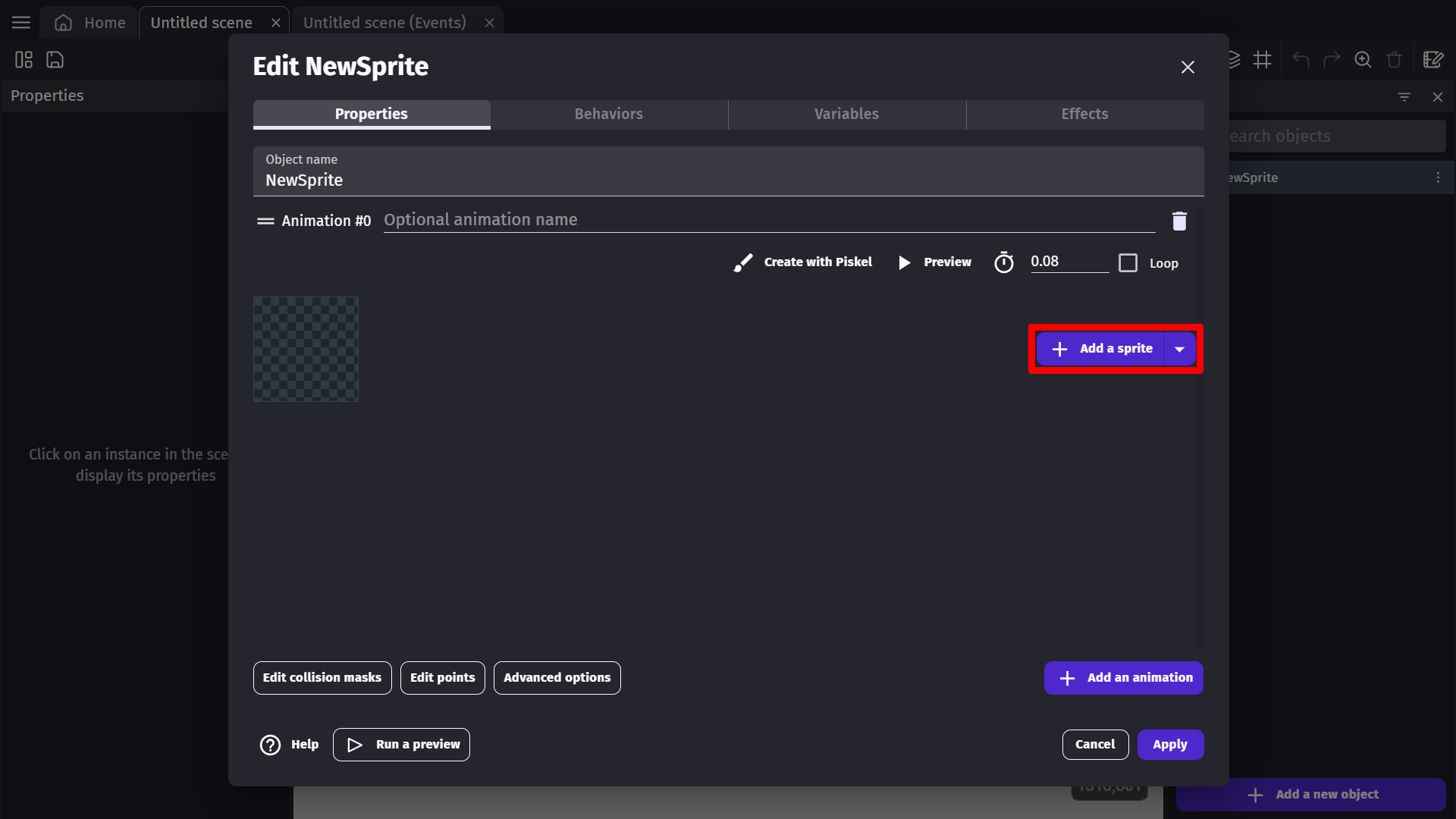 To add a sprite to your scene, select the "Click to add an object" option located on the right at the bottom of the objects panel.