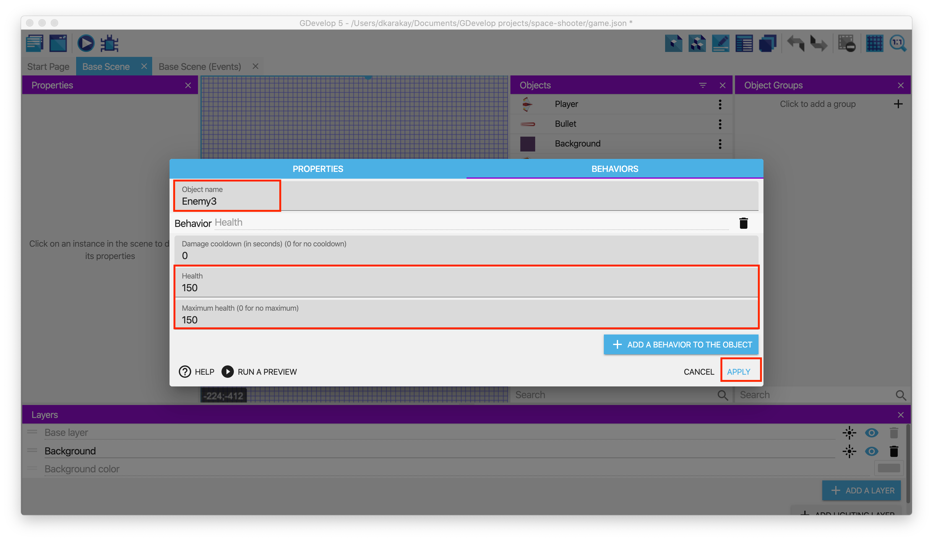 Open the behavior page of Enemy3 and change Health & Maximum Health to 150.